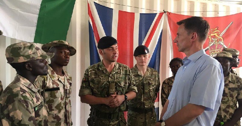 Foreign secretary meets with Nigerian and British soldiers who are part of a training and support programme by British military.