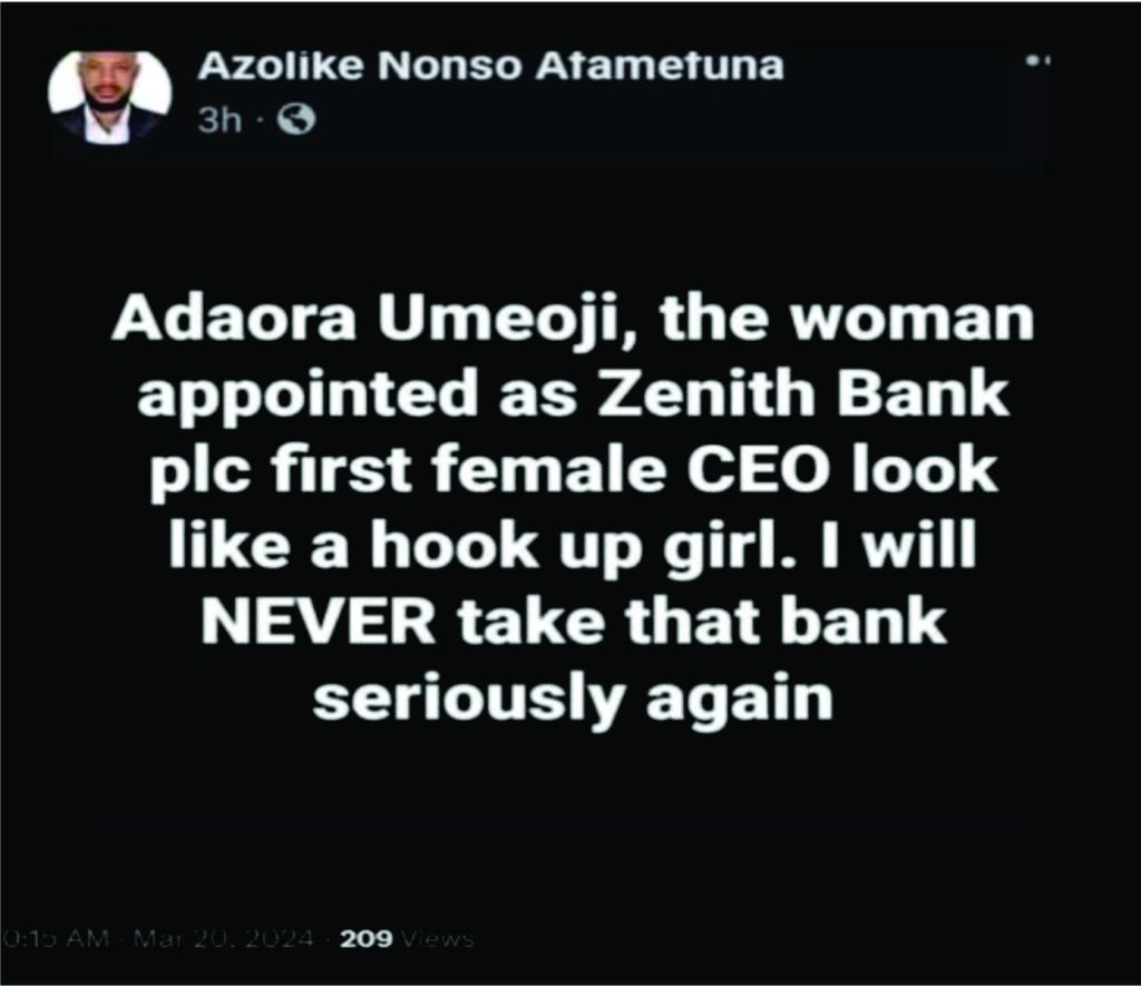However, the release of the official picture of the new CEO was to become a subject of misogynistic statements by some persons online, among which was a post by a Facebook account holder by the name Azolike Nonso Afamefuna. The crux of the matter and the grouse of the Facebook post made by Afamefuna, on March 20, 2024, sequel to the announcement of Umeoji as the CEO of Zenith Bank was that she was ‘too beautiful’ to be a professional banker. Discarding her professional qualifications and experience, the post had insinuated that Dr Adaora Umeoji’s emergence as the bank’s CEO was because of her beauty and sexual escapades, rather than her professional qualifications or achievements. In the post, which was widely condemned, and which the account holder, later deleted with an apology, Afamefuna had stated that Umeoji looked like a ‘hook-up girl’, (a terminology which generally refers to a lady who is involved in casual sexual relationships).