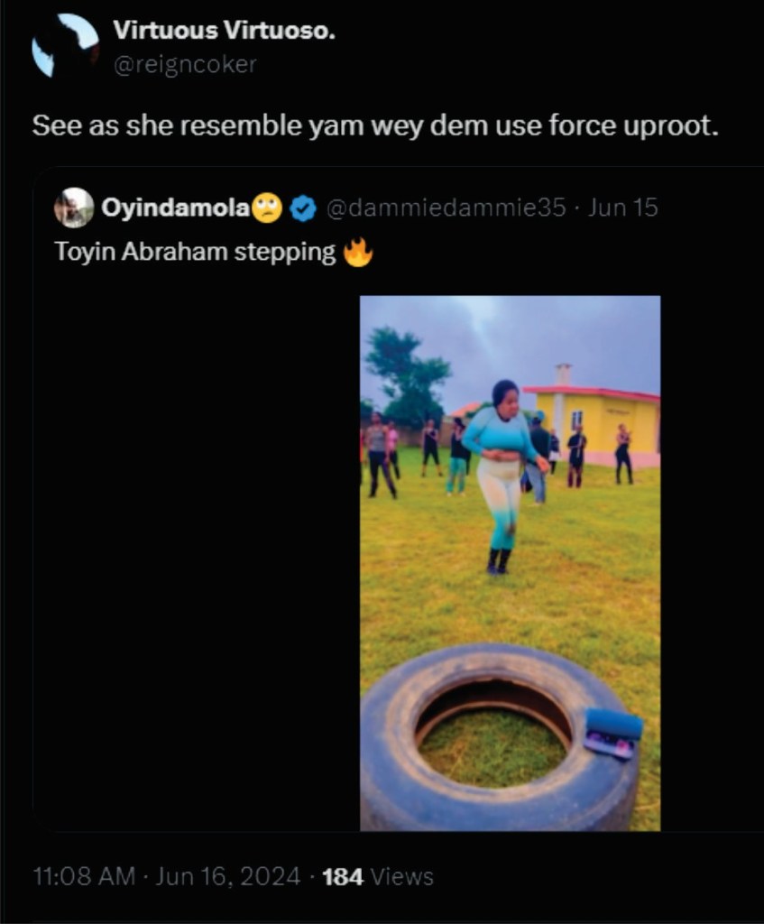 In another inference as contained in the report, Toyin Abraham (a Nollywood actress), in a demeaning and disrespectful manner was objectified with her legs described as ‘a yam that has been forcibly uprooted.’ While the original post which was viral on Facebook and Instagram was that of a short video with the headline, ‘Toyin Abraham shows off her amazing dance steps’ and ‘Actress Toyin Abraham Flaunts her Amazing Dancing Moves!’, the headline used by an X user @reigncoker on the short (7seconds) video post was a headline which was a derisive and deliberate statement to belittle and degrade her, reflecting an underlying attitude of Misogyny and disrespect for her achievements. The choice of words, expressed in indigenous pidgin language objectifies the actress, who was dancing, during what appears to be a work-out/exercise session.