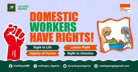 Since 2020, CEE-HOPE which works with at-risk young people and marginalised populations, has campaigned for Nigerian domestic workers’ rights through wide-ranging initiatives including awareness creation through multileveled media platforms, engagement of multi-sectoral stakeholders (activists, unionists, media representatives, community leaders, domestic workers, employers and others) including law makers.